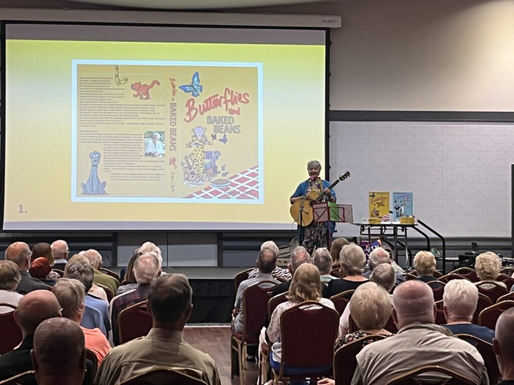 Our August 2025 meeting featured Suzi Clarke, a local author, playwright, lyricist, guitarist, painter and event designer. A very interesting, warm-hearted and informative presentation including songs with guitar accompaniment, about her life and family and her experience of looking after her dad. Her book 'Butterflies and Baked Beans' is available.